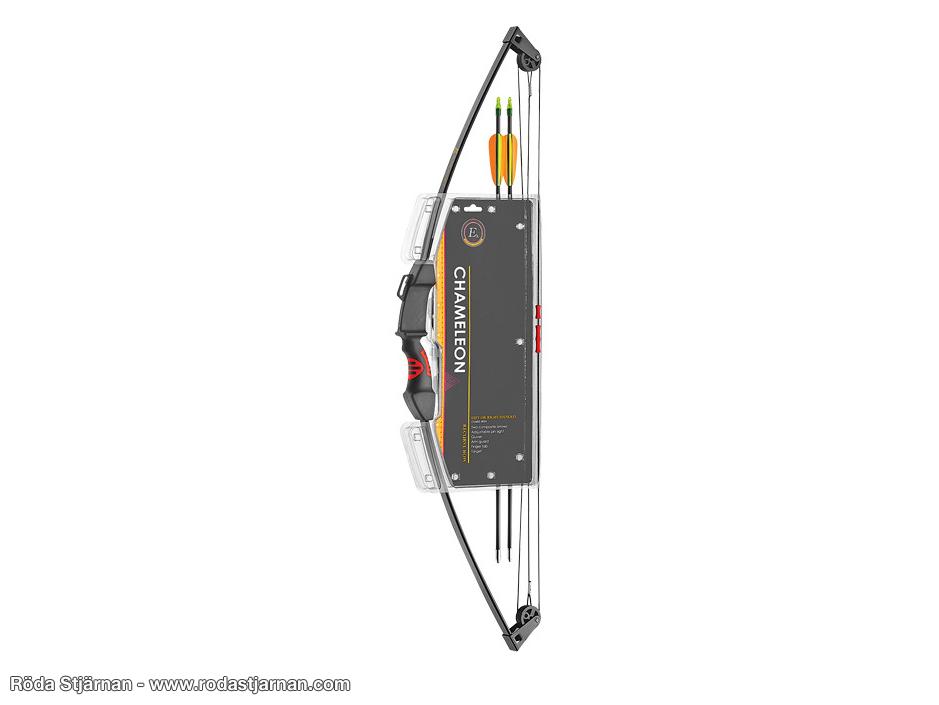 EK Chameleon Compound er en lett og brukervennlig compoundbue utviklet for barn og yngre ungdommer, med en anbefalt kroppslengde på cirka 120–145 cm, som tilsvarer omtrent 8–12 års alder. Den lave drakraften på 10–15 lbs og en trekkelengde på 23,75" gjør den enkel å håndtere for mindre skyttere. Buen veier kun 470 gram og er utstyrt med en 65 % let off, som betyr at skytteren bare trenger å holde igjen en tredjedel av drakraften når buen er fullt oppspent. Det gjør det lettere å sikte stabilt og avfyre kontrollert. Konstruksjonen består av slitesterke glassfiberlemmer og buen leveres komplett med alt som trengs for å komme i gang med en gang – inkludert piler, beskyttelse og måltavle. Strengen er dessuten utstyrt med fingerrollers som beskytter fingrene og gjør skytingen mer komfortabel.