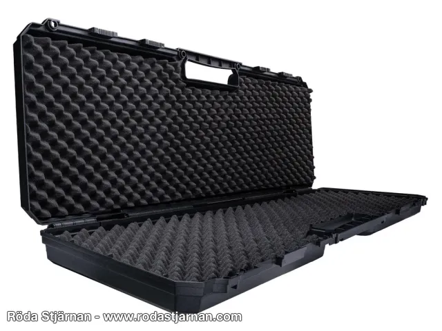 Väskan är tillverkad i tålig polymer som skyddar mot stötar, tryck och yttre påverkan. Invändigt finns vågskuren skumplast i både lock och botten som hjälper till att hålla vapnet på plats och dämpar vibrationer under transport.